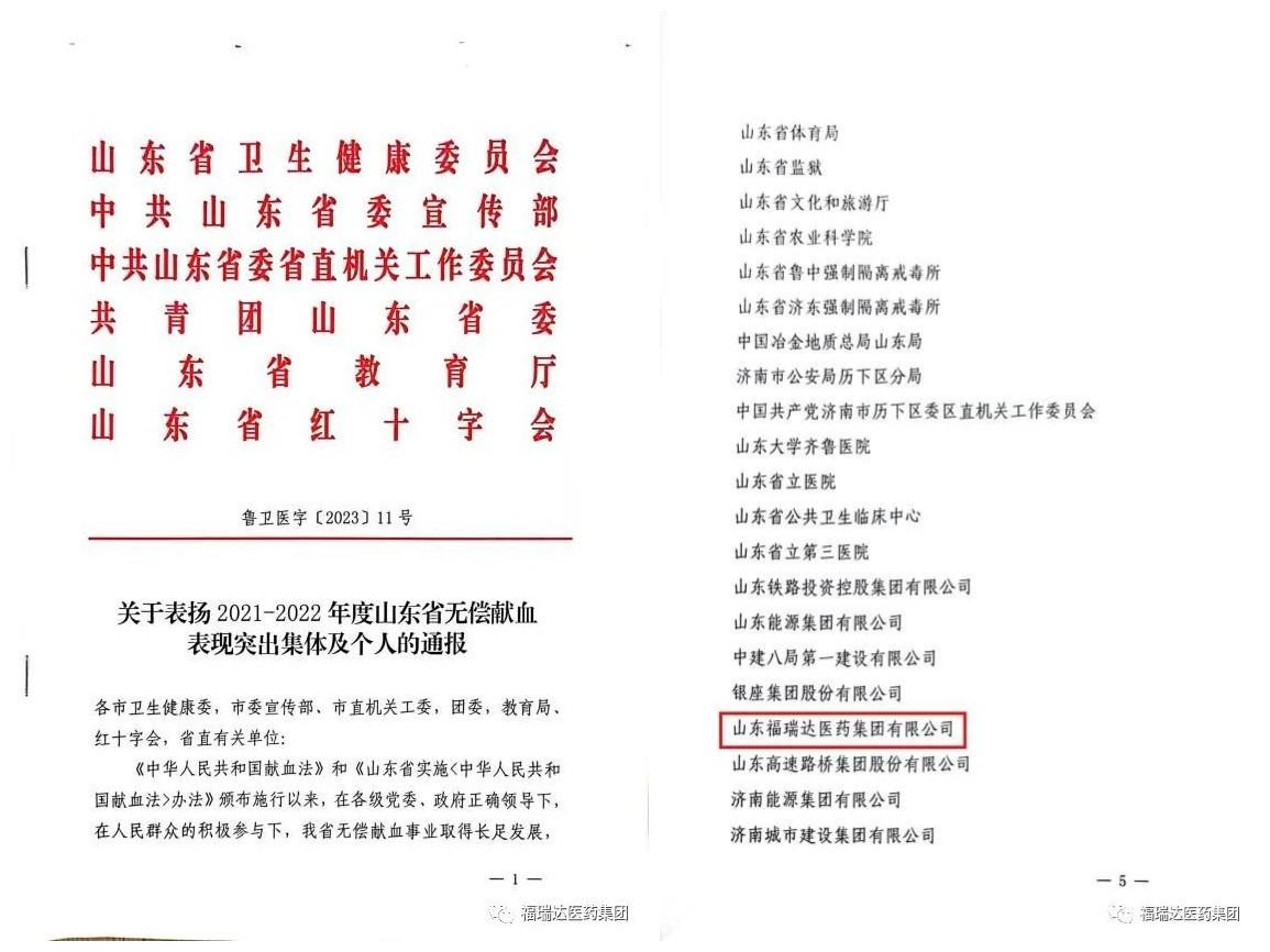 6月14日,山東省2023年世界獻(xiàn)血者日宣傳活動(dòng)在濟(jì)南舉行,山東省衛(wèi)生健康委員會(huì)等8家單位聯(lián)合印發(fā)魯衛(wèi)字【2023】11號(hào)《關(guān)于表揚(yáng)2021-2023年度山東省無償獻(xiàn)血表現(xiàn)突出集體及個(gè)人的通報(bào)》,山東福瑞達(dá)醫(yī)藥集團(tuán)有限公司榮獲“2021-2022年度山東省無償獻(xiàn)血組織表現(xiàn)突出單位”。