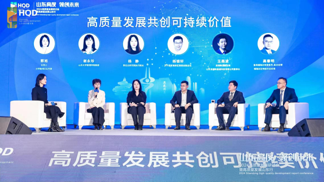 研討會(huì)上還舉行了圓桌論壇,在計(jì)然智庫(kù)ESG專家、 ESG(山東)研究聯(lián)合體專家郭旭的主持下,山東大學(xué)管理學(xué)院教授謝永珍,責(zé)任云研究院執(zhí)行院長(zhǎng)楊靜,濟(jì)寧國(guó)家高新區(qū)管委會(huì)副主任楊銀軒,浪潮集團(tuán)副總裁、山東浪潮新基建科技有限公司董事長(zhǎng)王燕波,魯商福瑞達(dá)黨委委員、副總經(jīng)理、福瑞達(dá)生物股份總經(jīng)理高春明圍繞“高質(zhì)量發(fā)展共創(chuàng)可持續(xù)價(jià)值”主題暢所欲言,共同研討高質(zhì)量發(fā)展新路徑。
