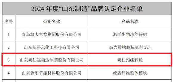 近日,山東省大中小企業融通創新聯合會公布了2024年度“山東制造”品牌認定企業名單,明仁福瑞達頸痛顆粒與焦點福瑞達透明質酸原料成功入選。