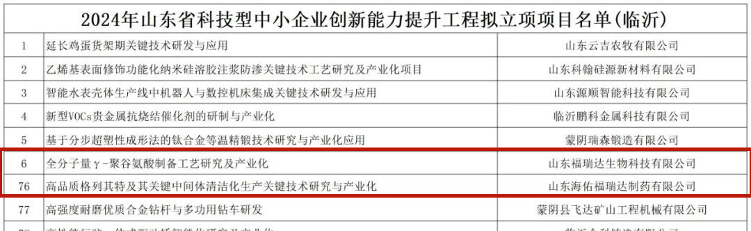 福瑞達(dá)旗下福瑞達(dá)生物科技與海佑福瑞達(dá)兩家公司申報(bào)的“全分子量γ-聚谷氨酸制備工藝研究及產(chǎn)業(yè)化”和“高品質(zhì)格列齊特及其關(guān)鍵中間體清潔化生產(chǎn)關(guān)鍵技術(shù)研究與產(chǎn)業(yè)化”兩項(xiàng)目成功獲得2024年省科技型中小企業(yè)創(chuàng)新能力提升工程立項(xiàng),兩項(xiàng)目立項(xiàng)金額1750萬元,獎(jiǎng)補(bǔ)資金近100萬元。