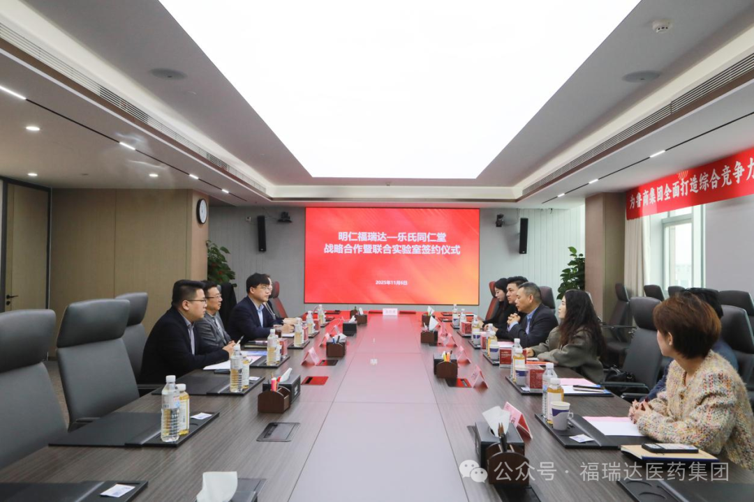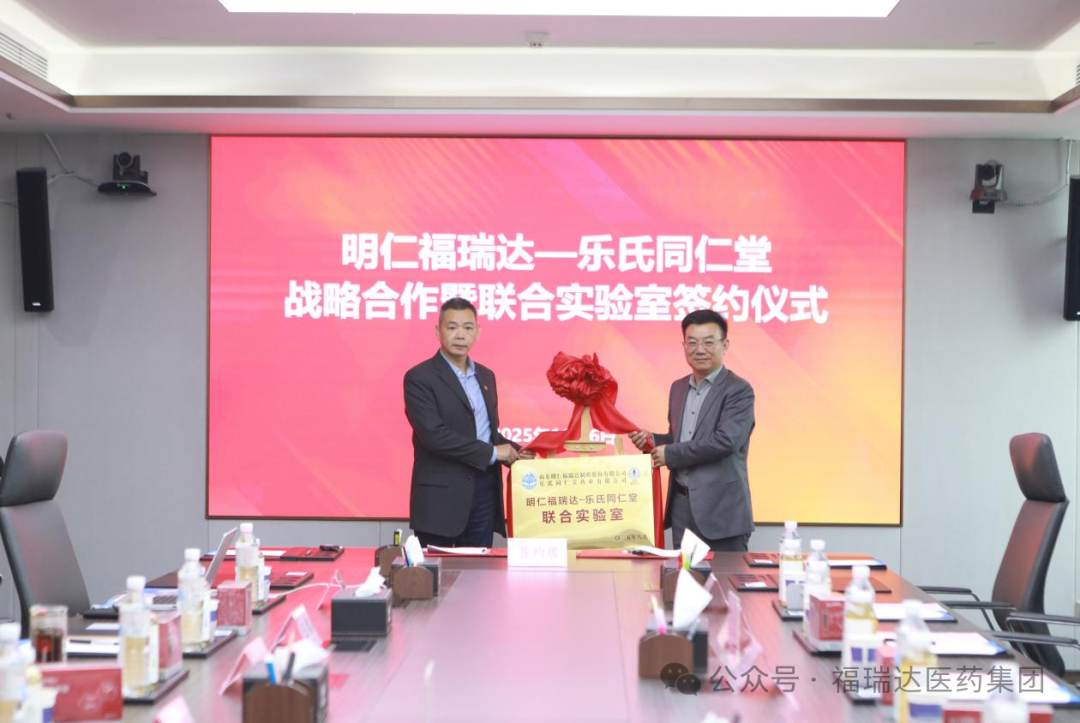 2025年11月7日上午,明仁福瑞達與臺灣樂氏同仁堂舉行戰略合作簽約儀式。樂氏同仁堂董事長、第十四代傳人樂覺心,與福瑞達黨委委員、副總經理,明仁福瑞達董事長、總經理徐傳彬共同簽署戰略合作協議,并為“明仁福瑞達—樂氏同仁堂聯合實驗室”揭牌。雙方合作推出的首款藥食同源功能性食品——“阿膠雪妍飲”正式投產上市。